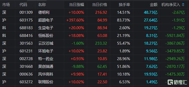 龙虎榜中涉及机构专用席位的个股中,当日净卖出额前三为德明利、超颖电子、生益电子,分别为2.67亿元、1.91亿元、1.29亿元。