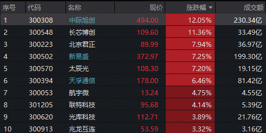 算力硬件午后持续爆发,创业板人工智能单日暴涨超5%!光模块CPO三巨头带头冲锋,中际旭创暴涨超12%续创新高,新易盛涨超7%,天孚通信涨超6%。其它热门个股方面,长芯博创涨超11%,北京君正、太辰光、联特科技等多股涨超3%。
