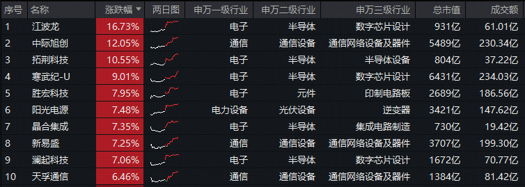 细分方向来看,半导体、算力等板块涨势如虹。半导体方面,存储芯片龙头江波龙领涨超16%,算力芯片龙头寒武纪涨逾9%登顶A股吸金榜+成交榜,股价重返1500元上方,超越贵州茅台。算力产业链中,光模块、PCB等板块领涨。光模块龙头中际旭创涨超12%创新高,印制电路板(PCB)龙头胜宏科技、光伏龙头阳光电源涨逾7%。