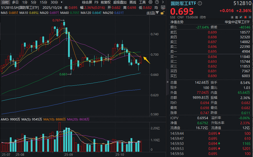重磅会议公报首提“航天强国”,10月24日,商业航天概念大爆发,强势带动国防军工板块快速崛起!场内热门国防军工ETF(512810)盘中上探2.8%,场内收涨2.36%,一举收复5日及10日均线,释放拐点信号,全天成交逾9899万元。