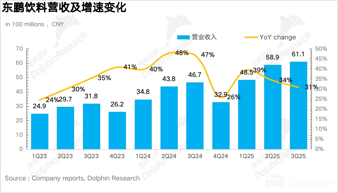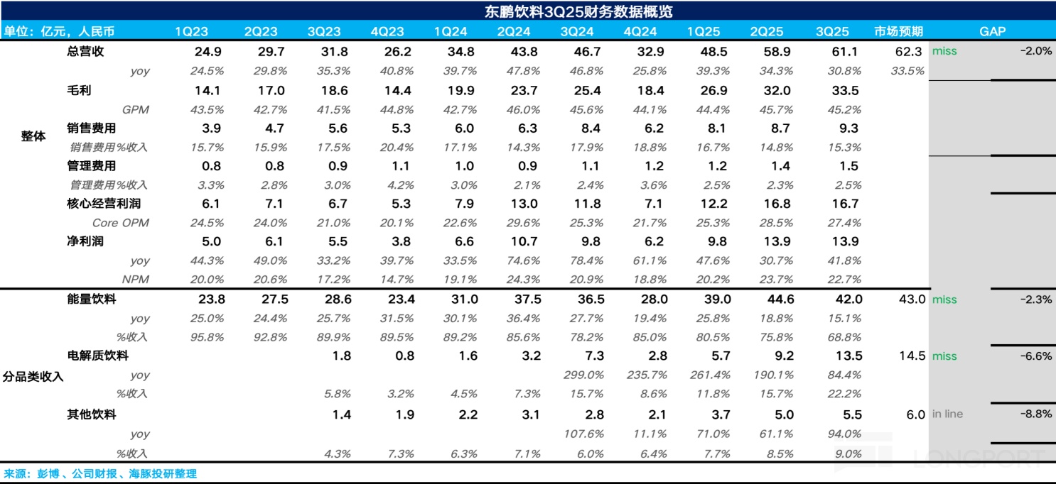 3Q25 东鹏饮料实现总营收 61.1 亿元,同比增长 30.8%,从趋势上看环比前两个季度有所降速。虽然公司的 “第二增长曲线” 电解质水依然在快速增长,但由于市场对东鹏的能量饮料业务预期仍然较高,因此整体业绩略低于市场预期。