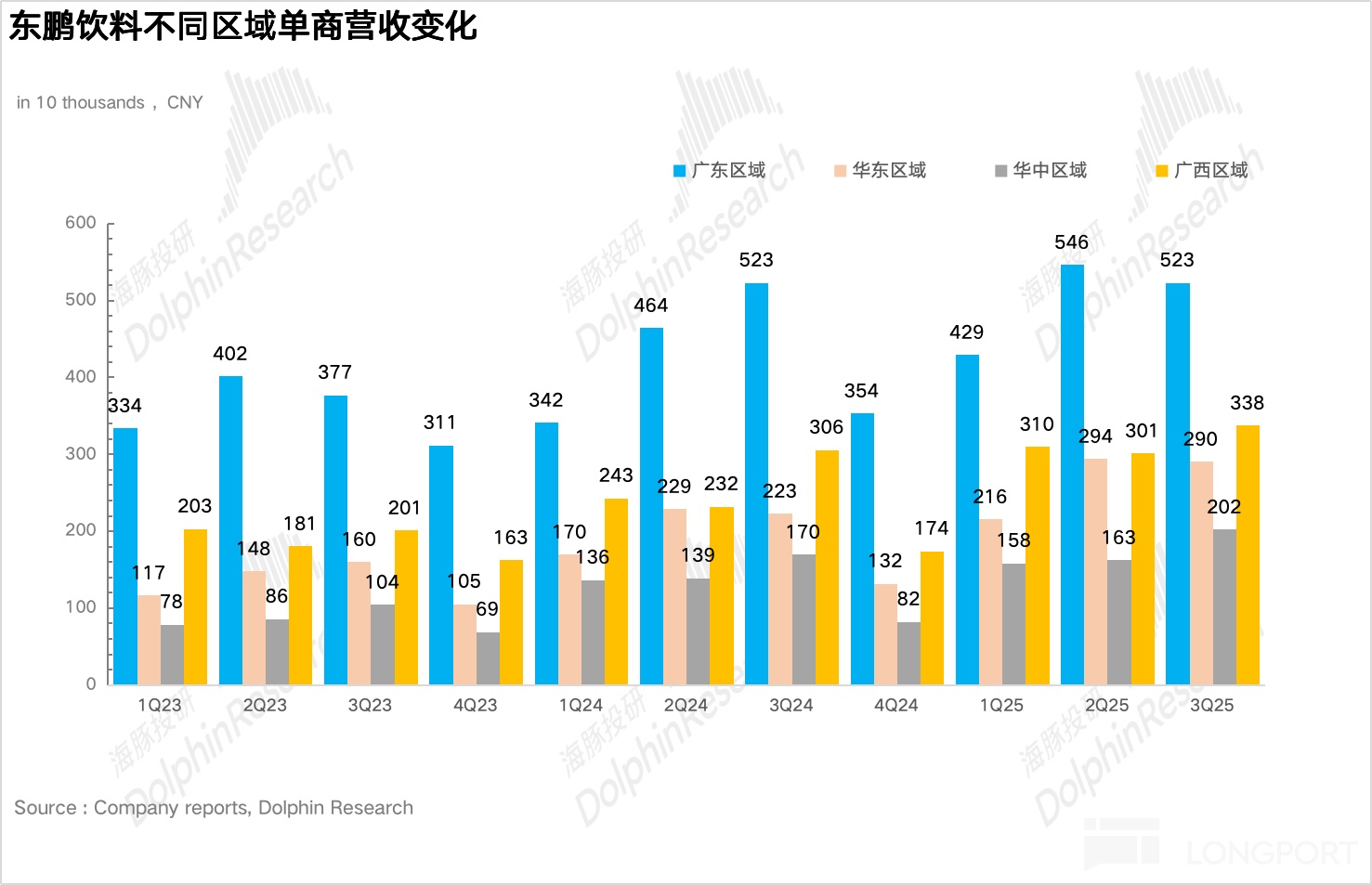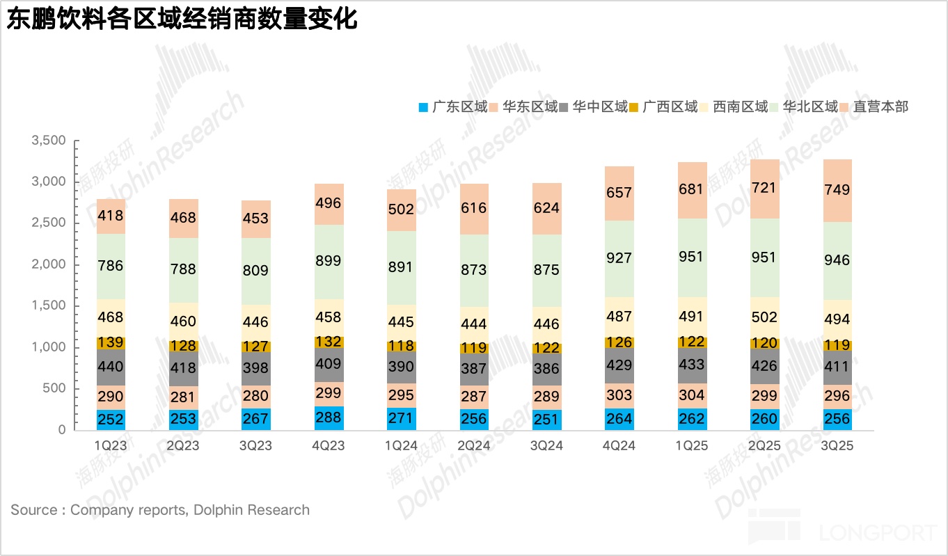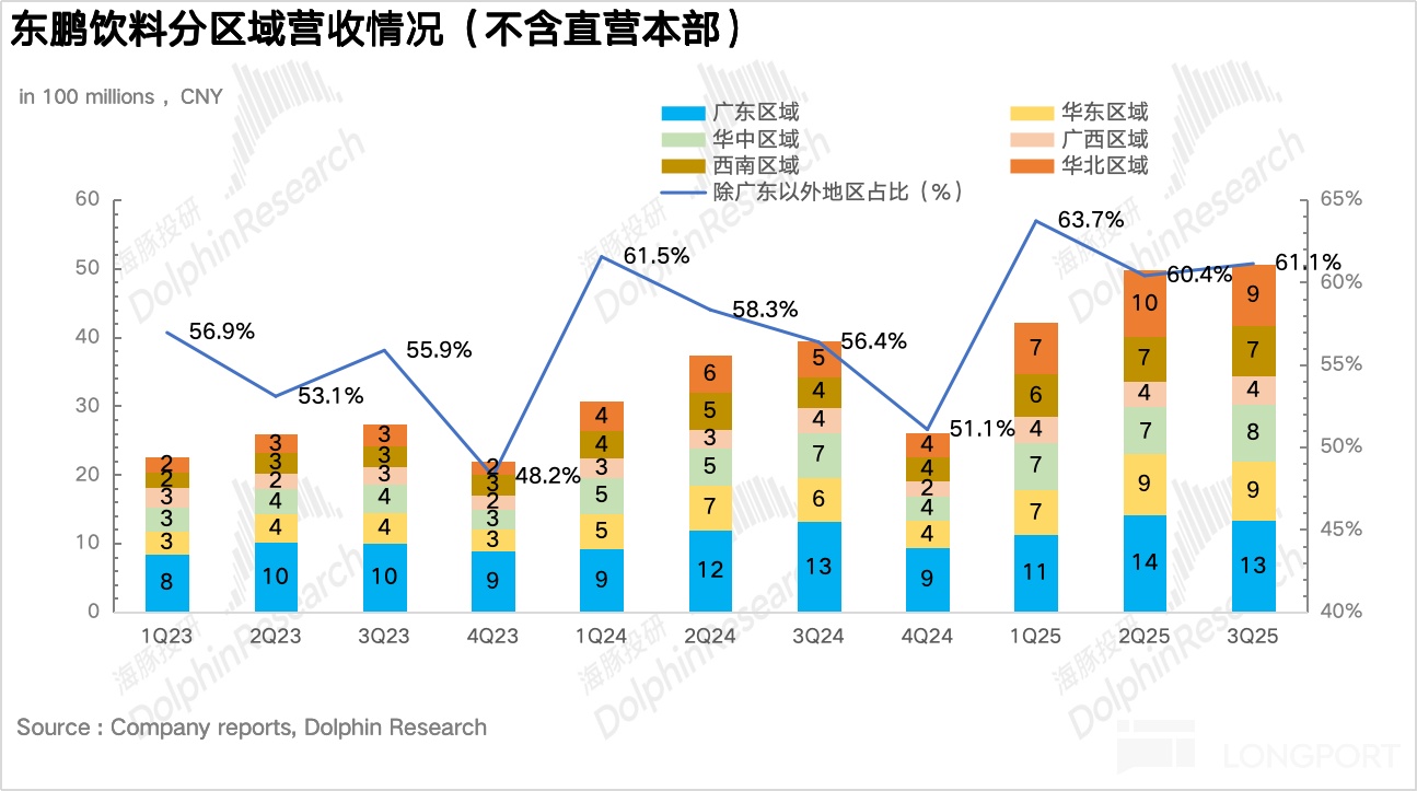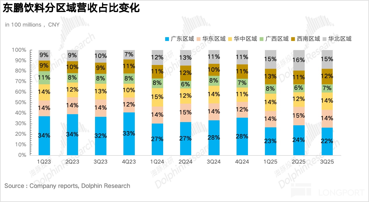 除广东以外的其他地区实现营收 37.3 亿元,同比增长 42%,仍然呈现出高于大盘增速的高速增长阶段。其中华北地区连续 3 个季度实现超过 70% 的增长,表现极为亮眼。如果把时间线推到 3 年前,彼时华北地区还是东鹏最为薄弱的环节,营收仅为 6 亿元,占比不足 7%。
