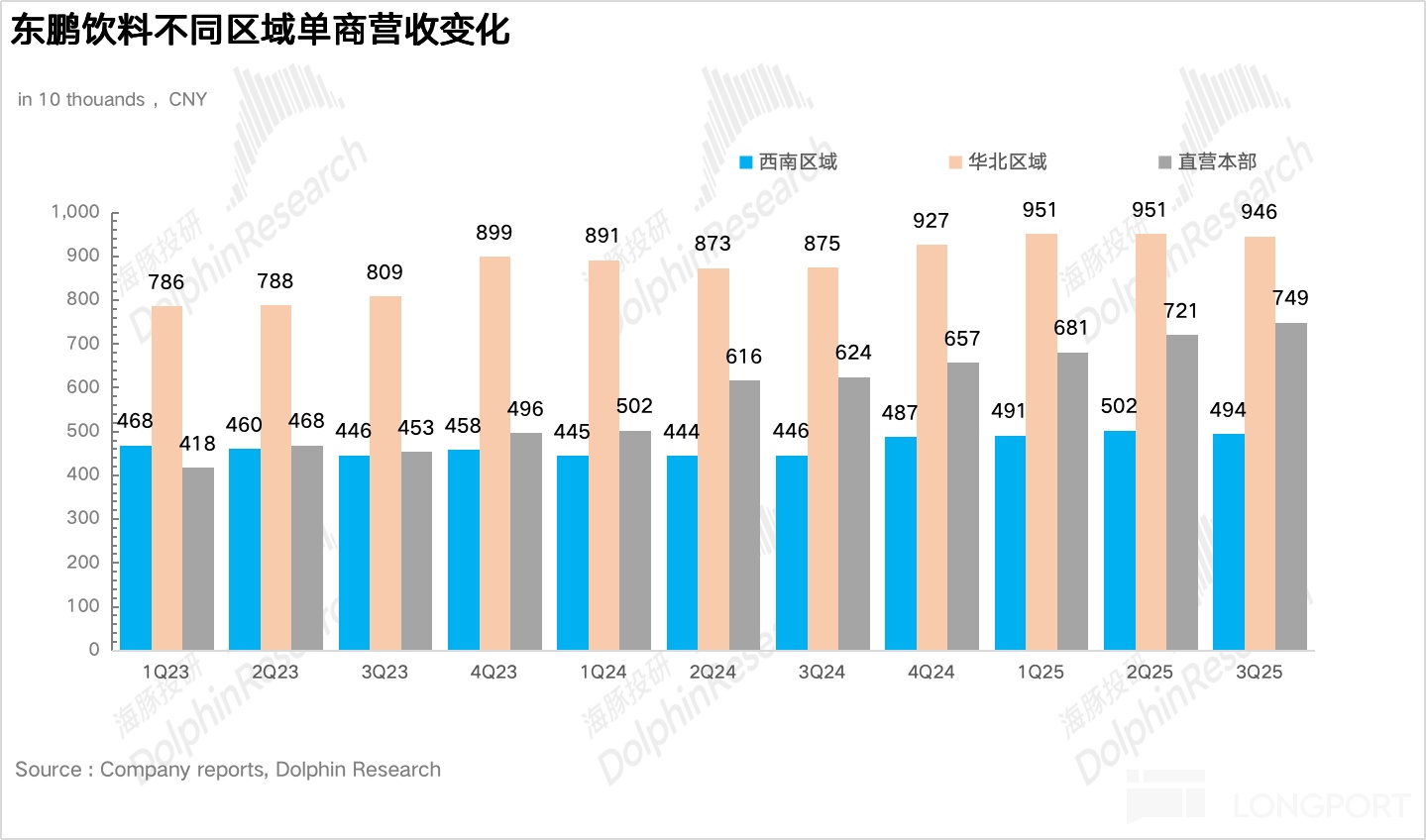 最后,从经销商的数量上看,除了直营本部外,其他地区的经销商数量都在下滑,说明当前东鹏已经度过了依赖经销商开疆拓土的阶段,目前更看重的是经销商质量。结合调研信息,目前公司正在持续对各个大区的经销商进行优胜劣汰,而通过经销商的 “清洗” 未来东鹏的单商经营质量将会更高。