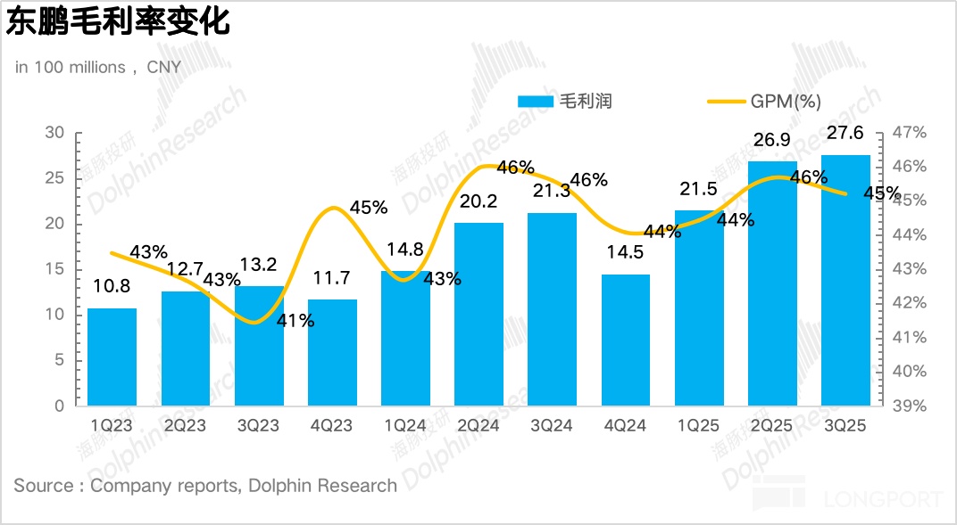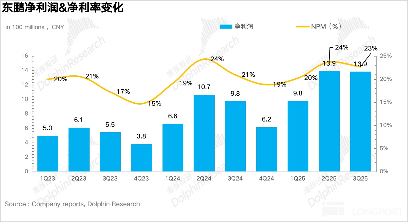 利润端,由于东鹏二季度费用投放的前置叠加整体公司经营杠杆的释放,3Q25 东鹏实现利润 13.9 亿元,同比增长 41.8%,仍然快于营收端的增长,整体的业绩质量还是比较高的。