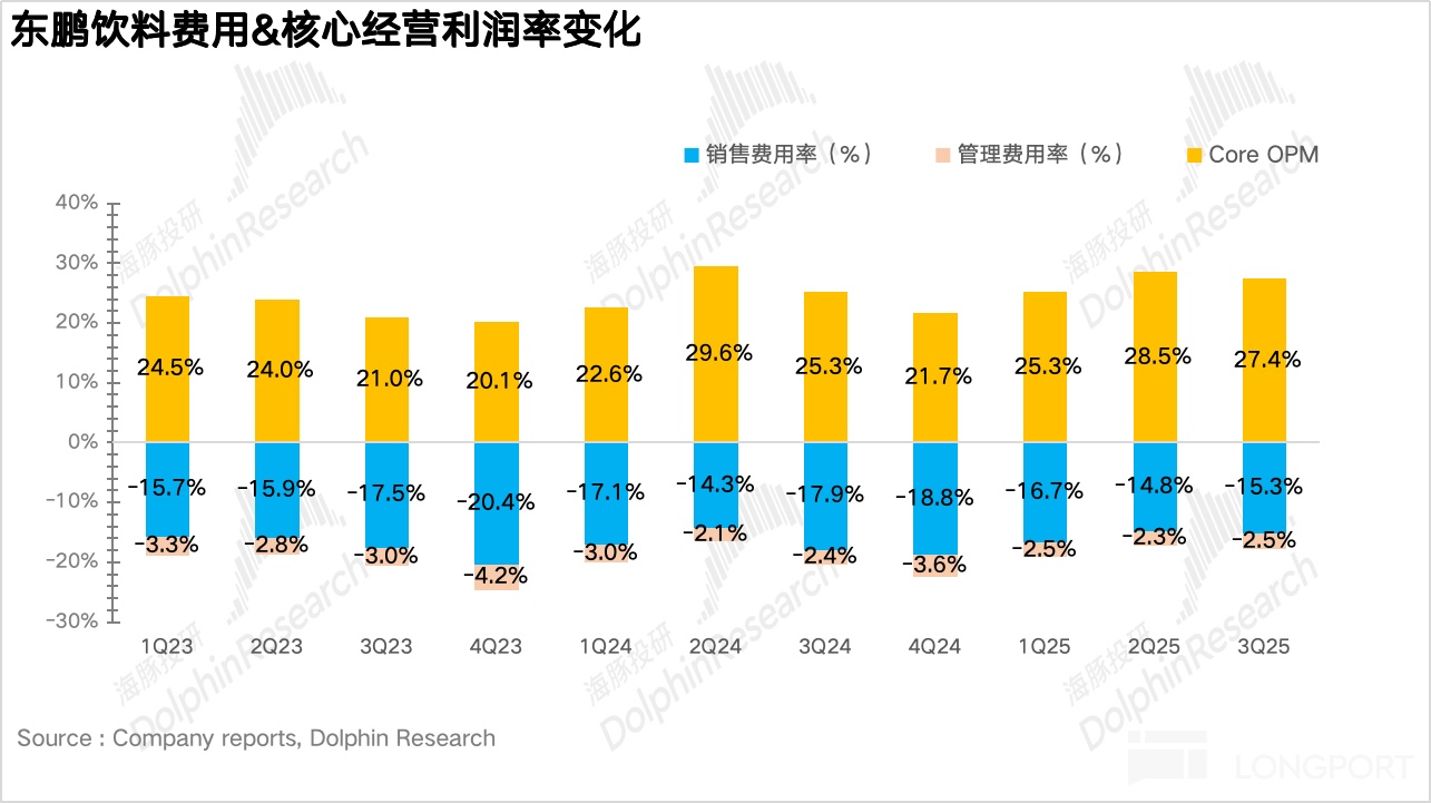 当前阶段市场显然更关心的是东鹏的 “第二增长曲线” 电解质水的增长情况。3Q25 电解质饮料实现营收 13.5 亿元,同比增长 84%,从趋势上看,经过连续四个季度 200% 以上的高速增长后,环比增速虽然有所下滑,但依然维持了比较高的增长,目前电解质水占比已经超过 20%,核心在于公司上半年提前进行了冰柜的前置投放和渠道扩张,在夏天旺季实现了显著放量。按照这个增长势头,如果按照去年同期的经营节奏去推算,全年补水啦超过 30 亿元基本确信无疑,将成为东鹏第一个 30 亿级别的大单品。