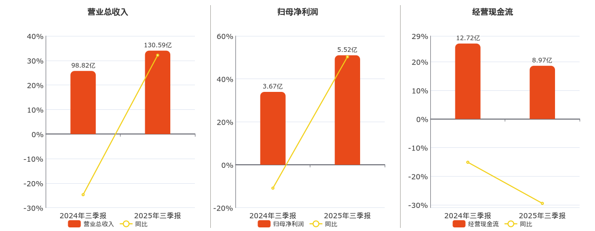 公司营业总收入为130.59亿元,较去年同报告期营业总收入增加29.98亿元,同比较去年同期上涨29.80%。归母净利润为5.52亿元,较去年同报告期归母净利润增加1.62亿元,同比较去年同期上涨41.54%。经营活动现金净流入为8.97亿元。