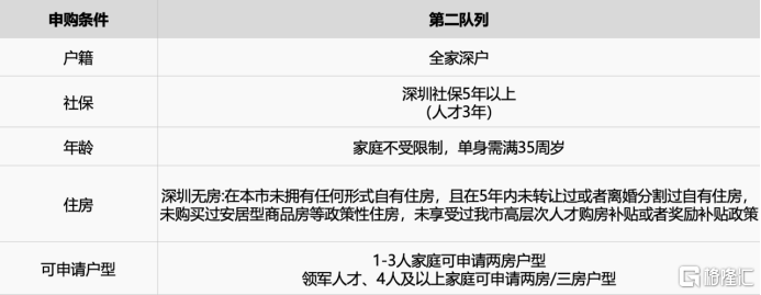 第二队列:深圳无房,全家深户,申请人5年社保(人才3年),家庭无年龄限制,单身需满35岁以上