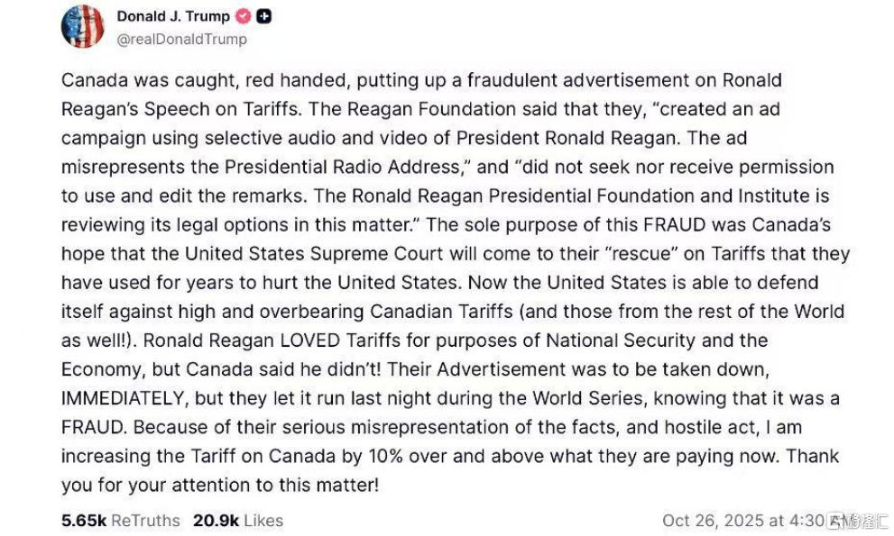 当地时间10月25日,美国总统特朗普在社交媒体上再度炮轰加拿大。