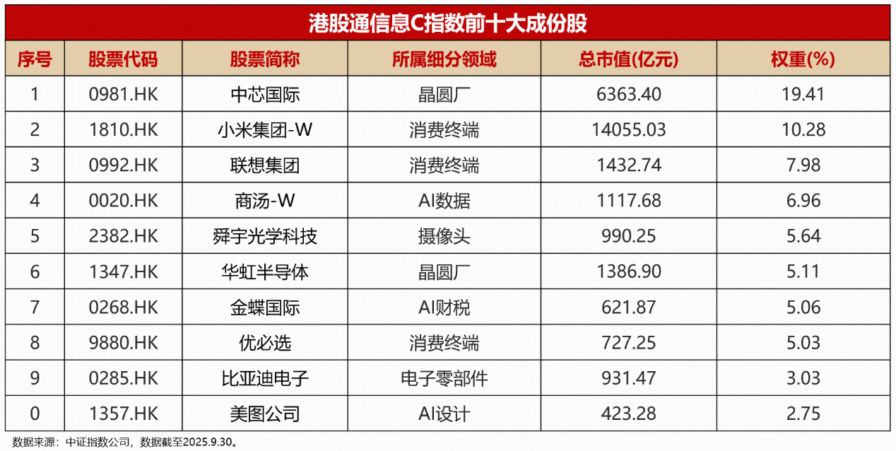 截至2025年9月末,港股通信息C指数成份股涵盖41只港股硬科技公司,其中国产芯片龙头——中芯国际权重占比达19.41%,小米集团权重占比10.28%,华虹半导体权重占比5.11%;该指数前五大权重股合计占比51%,前十大权重股合计占比72%,其龙头股权重集中度高,更加契合科技产业龙头效应客观规律,适合捕捉龙头公司长期增长机遇。该指数的编制规则设置单个成份股权重上限为15%,伴随个股市值波动权重占比会相应变化,可能会出现超过15%的情形。该指数样本每半年调整一次,届时单个成份股权重上限一般会平衡至15%。