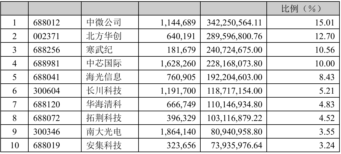 该ETF跟踪中证半导,截至三季报前十大重仓分别为中微公司(15.01%)、北方华创(12.70%)、寒武纪(10.56%)、中芯国际(10.00%)、海光信息(8.43%)、长川科技(5.21%)、华海清科(4.83%)、拓荆科技(4.52%)、南大光电(3.55%)、安集科技(3.24%),合计占比超过78%。