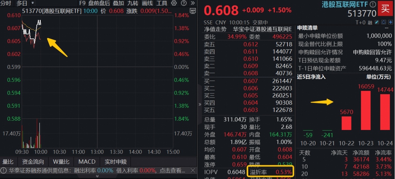 港股AI核心工具——港股互联网ETF(513770)早盘高开,场内价格现涨1.5%,盘中宽幅溢价,实时溢价率超0.5%,显示买盘资金强势介入。上交所数据显示,港股互联网ETF(513770)近3日连续获资金净流入合计3.65亿元