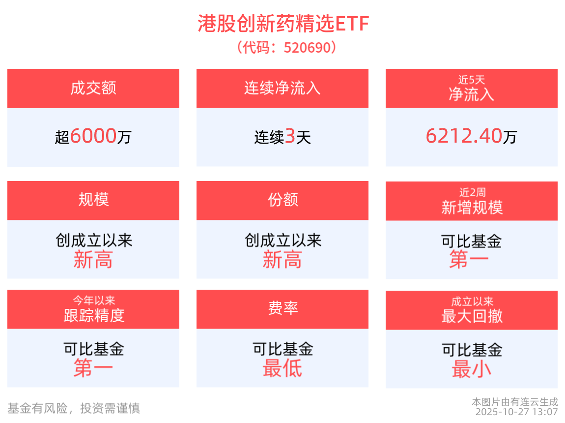 流动性方面,港股创新药精选ETF盘中换手12.59%,成交6296.43万元,市场交投活跃。拉长时间看,截至10月24日,港股创新药精选ETF近1年日均成交1.22亿元。