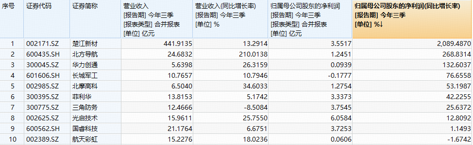 据统计,截至当前,国防军工ETF(512810)17只成份股已披露三季报,其中15只实现盈利,9只净利同比正增长。楚江新材前三季净利同比暴增20倍,北方导航、华力创通净利均翻倍增长。