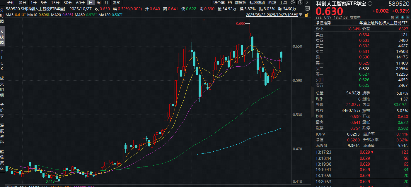 今日(10月27日)重点布局国产AI产业链的科创人工智能ETF(589520)场内价格早盘一度涨超1.5%,现涨0.32%,场内频现溢价区间,显示买盘资金更为强势。成份股方面,威胜信息涨超3%,道通科技、澜起科技、萤石网络、复旦微电涨逾2%,金山办公、虹软科技等个股跟涨。