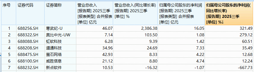图:科创人工智能ETF(589520)标的指数成份股三季报业绩(截至2025.10.26)