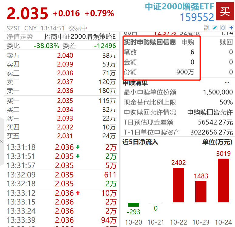 随着市场风险偏好回暖,中证2000增强ETF(159552)近日连续“吸金”,行情数据显示,今日盘中该ETF获资金净流入超1800万元,此前3个交易日获资金连续净流入约6900万元。
