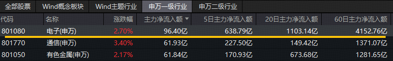 资金面上,主力资金“偏爱”电子板块!截至发稿,电子板块获主力资金净流入96亿元,拉长时间看,近5日、近20日、近60日分别吸金638亿元、1103亿元、4152亿元,持续高居31个申万一级行业首位!