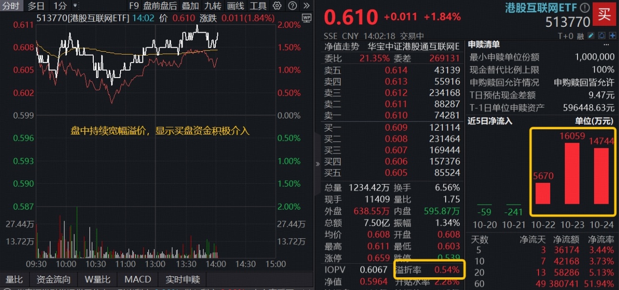 27日午后,港股AI延续强势,重仓互联网龙头的港股互联网ETF(513770)午后二度拉升,场内价格一度涨逾2%,现涨1.84%,,盘中溢价高企,实时溢价率超0.5%,显示买盘资金强势介入。上交所数据显示,港股互联网ETF(513770)近3日连续获资金净流入合计3.65亿元。