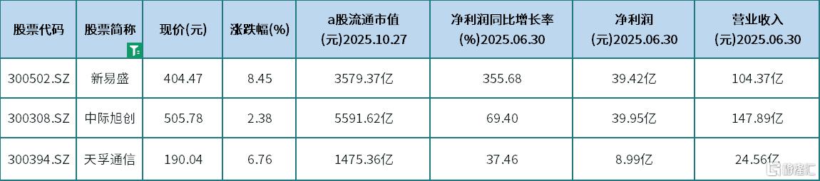 业务规模比中际旭创略小的新易盛股价亦创新高,截止收盘涨超8%,总市值超4000亿元;天孚通信涨超6%,市值1478亿元。