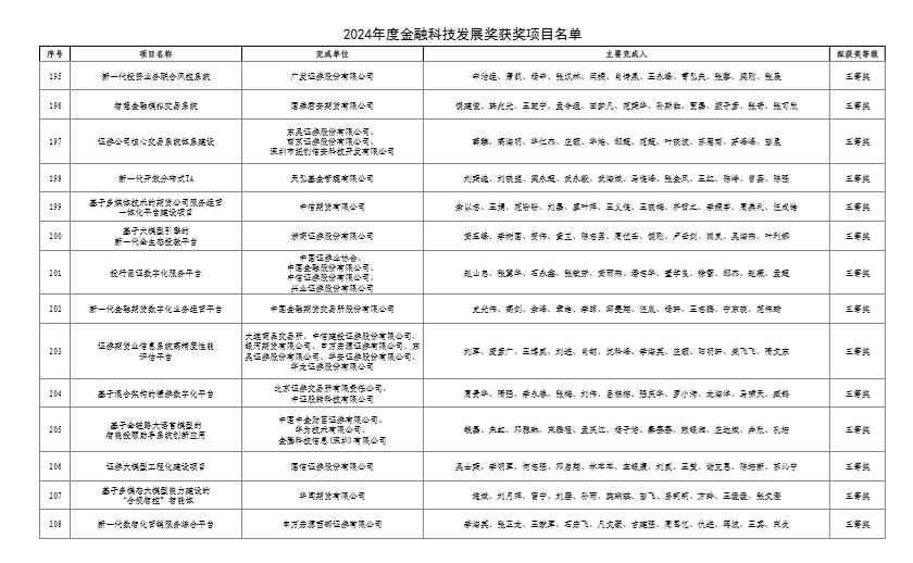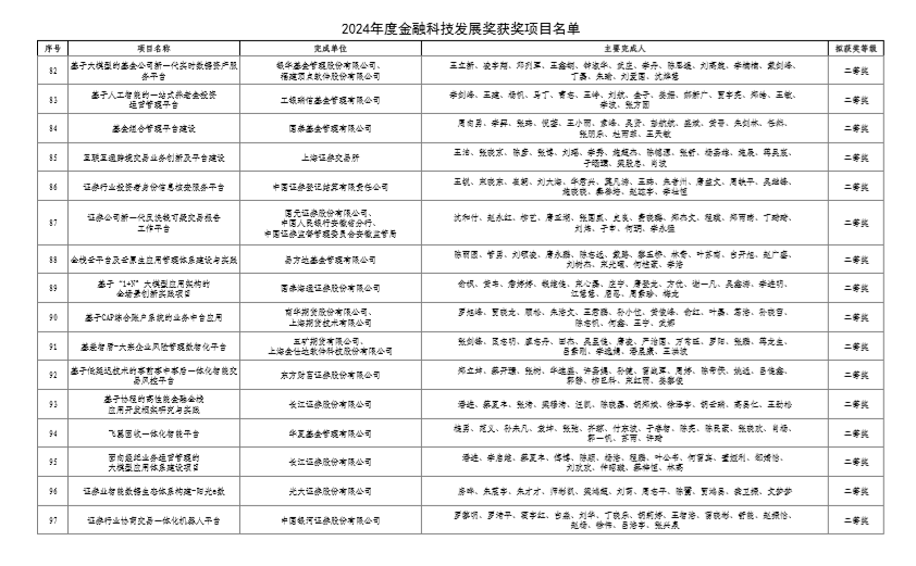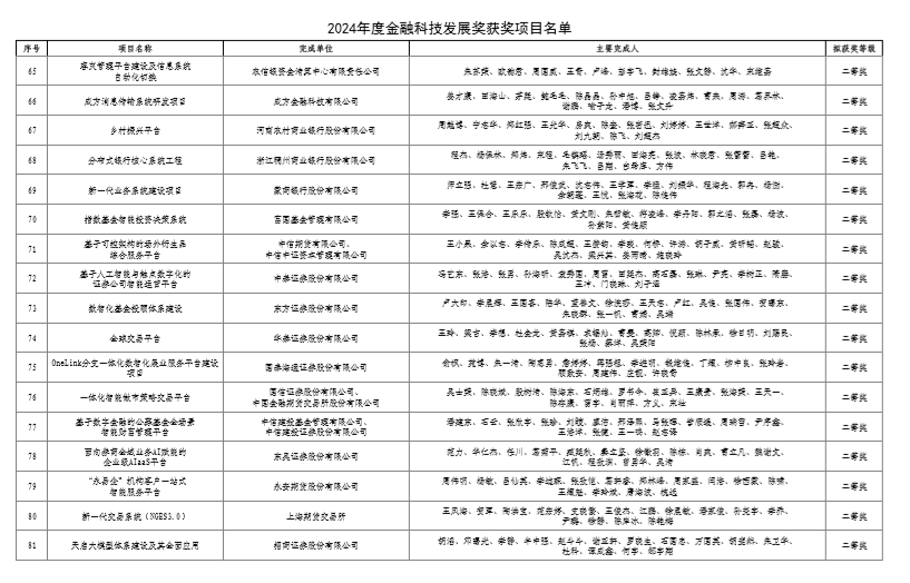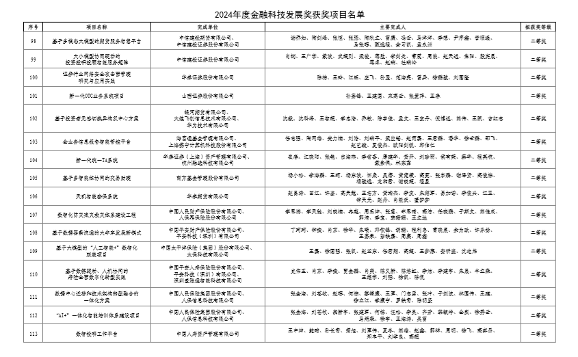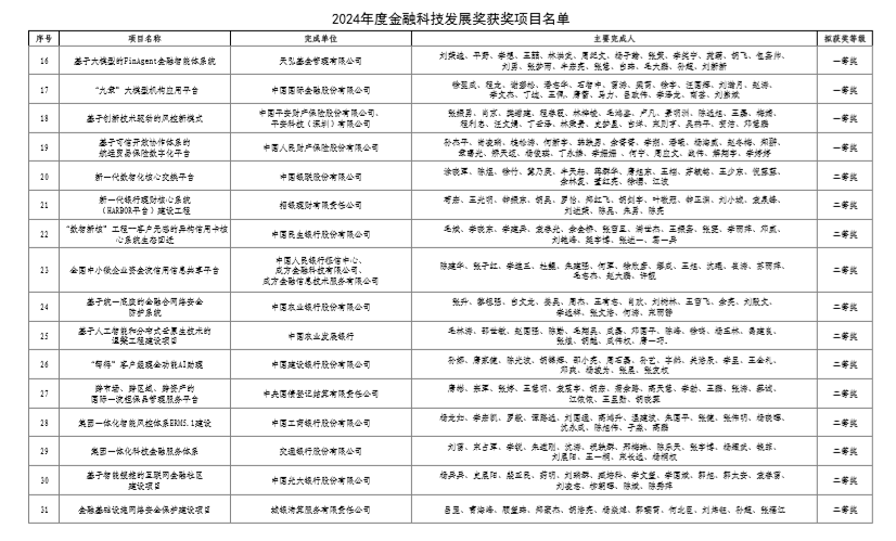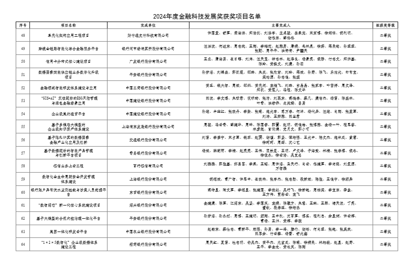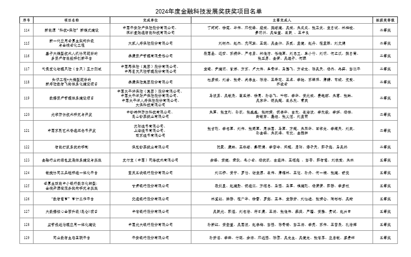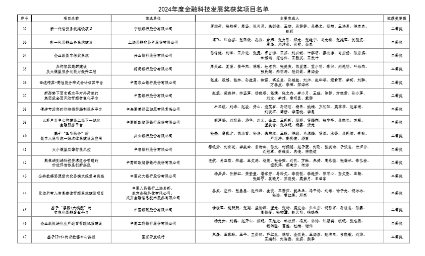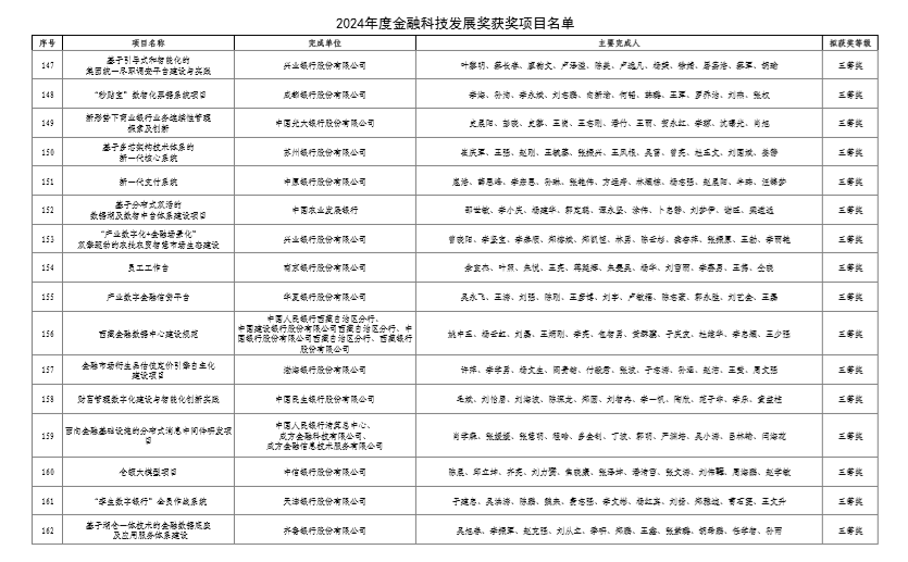 在103项二等奖中,银行机构占据36个席位。其中部分股份行、城商行获奖。如宁波银行的“新一代信贷系统建设项目”、兴业银行的“企业级数字档案系统”和“基于‘三币融合’的数字人民币统一账本体系建设及应用”、招商银行的“异构智算集群建设及大模型服务化能力提升工程”等。另外,青岛银行、东营银行、绍兴银行、蒙商银行、河南农商银行等也均有项目获奖。