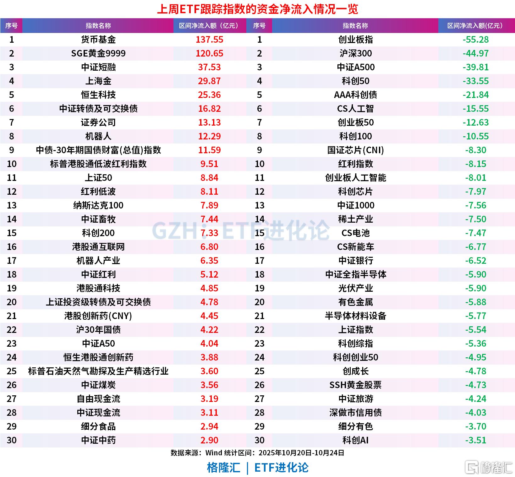 指数方面,货币基金、SGE黄金9999、中证短融、上海金、恒生科技、中证转债及可交换债、证券公司上周分别净流入137.55 亿元、120.65 亿元、37.53 亿元、29.87 亿元、25.36 亿元、16.82 亿元、13.13 亿元。