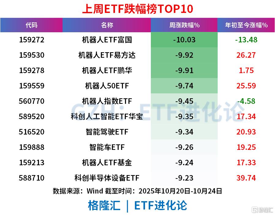 跌幅方面,机器人ETF富国、机器人ETF易方达、机器人ETF鹏华、机器人50ETF、机器人指数ETF、科创人工智能ETF华宝、智能驾驶ETF上周分别跌10.03 %、9.92 %、9.91 %、9.74 %、9.45 %、9.35 %、9.34 %。