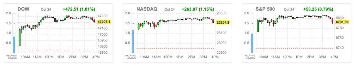 本周美股呈现 “预期强化 - 资金入场 - 指数突破” 的正向循环,截至周五收盘,标普 500 指数上涨 0.79% 至 6791.69 点,与道指(47207.12 点,+1.01%)、纳指(23204.87 点,+1.15%)同步刷新历史新高。核心催化因素来自三方面: