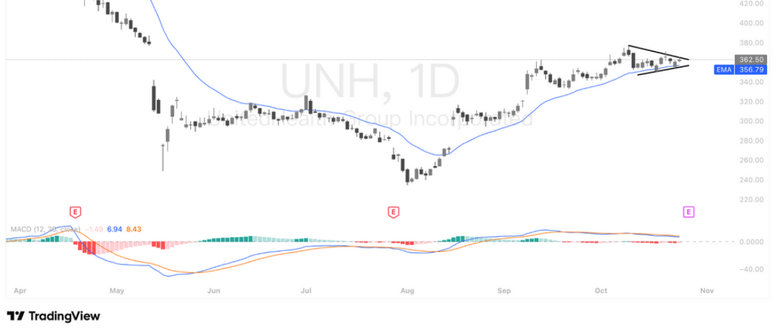 从日线结构来看,联合健康(UNH)近期在连续反弹后进入典型的对称三角整理形态。股价自8月低点约$290反弹至$380附近后,经历横盘收敛,目前运行于三角形末端,短线方向即将选择。