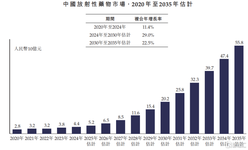 2024年,中国放射性药物市场估值为44亿人民币,仍处于低渗透状态,预计到2030年将增长至202亿元,同期复合年增长率为29%。
