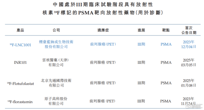 截至9月22日,中国尚无获批具有放射性核素18F标记的PSMA靶向诊断药物。在中国,有4款PSMA靶向放射性诊断药物处于III期临床阶段,其中包括候选药物18F-LNC1001。