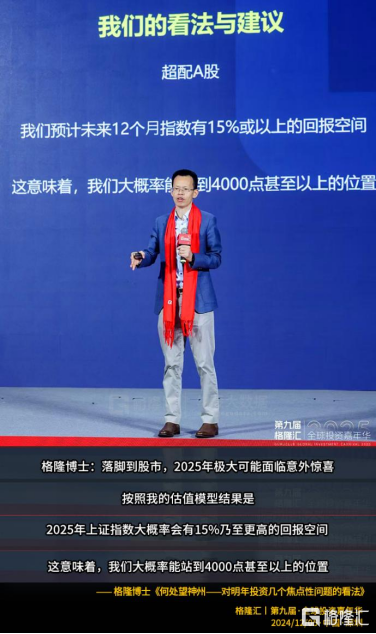 2024年12月5日格隆汇第九届全球投资嘉年华上,兼具经济学家深邃洞察与文人温润情怀的格隆博士明确指出:“投资需立足人类进化与全球格局,而非短期波动。据估值模型,2025年上证指数大概率涨15%以上,站上4000点---这是对中国在人类文明升级中角色的笃定。”