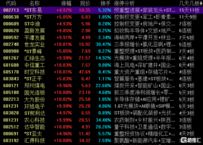 焦点股方面,*ST东易15天11板,*ST万方11天9板,ST中迪7连板,盈新发展6连板,平潭发展7天5板,世龙实业5连板,*ST景峰7天4板,汇绿生态、时空重工6天4板,中信重工、*ST正平4连板。