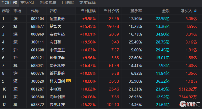 龙虎榜单日净买入额前三为恒宝股份、精智达、安泰科技,分别为5.06亿元、3.65亿元、3.31亿元。