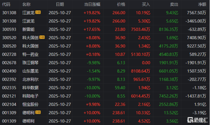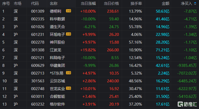 龙虎榜单日净卖出额前三为科华数据、道生天合、神开股份,分别为4.71亿元、1.39亿元、1.17亿元。