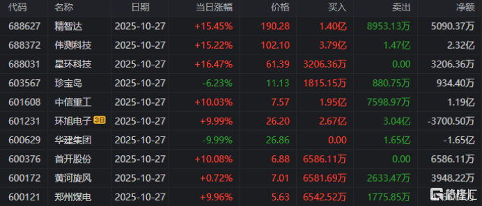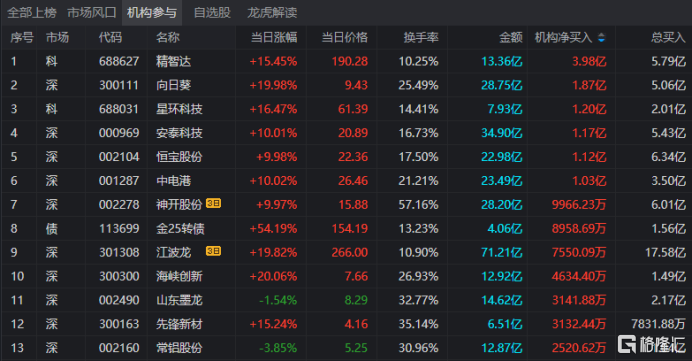 龙虎榜中涉及机构专用席位的个股中,当日净买入额前三为精智达、向日葵、星环科技,分别为 3.98 亿元、1.87 亿元、1.20 亿元。