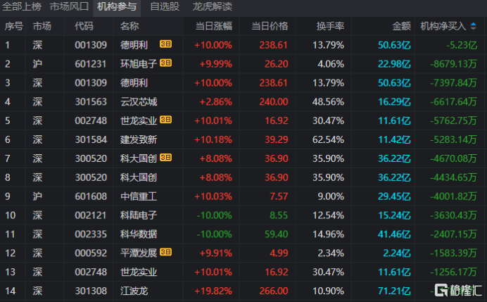 龙虎榜中涉及机构专用席位的个股中,当日净卖出额前三为德明利、云汉芯城、建发致新,分别为 7397.84 万元、6617.64 万元、5283.14 万元。