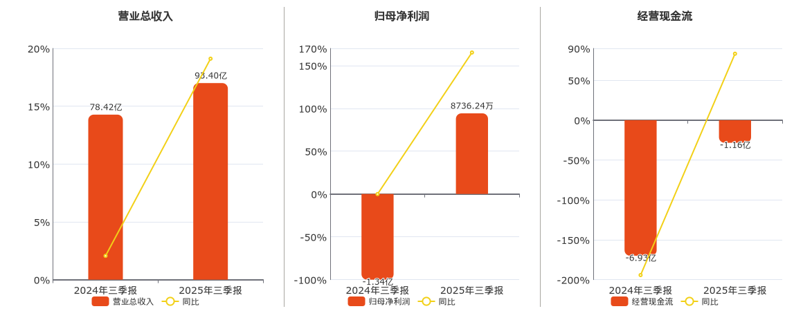 公司营业总收入为93.40亿元,较去年同报告期营业总收入增加14.99亿元,实现2年连续上涨,同比较去年同期上涨19.11%。归母净利润为8736.24万元,较去年同报告期归母净利润增加2.21亿元。经营活动现金净流入为-1.16亿元,较去年同报告期经营活动现金净流入增加5.77亿元。