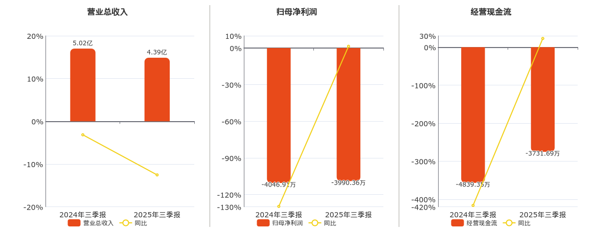 公司营业总收入为4.39亿元,较去年同报告期营业总收入减少6301.48万元,同比较去年同期下降12.54%。归母净利润为-3990.36万元。经营活动现金净流入为-3731.69万元。