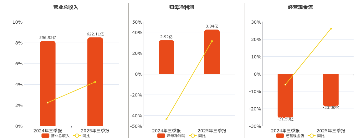 公司营业总收入为622.11亿元,较去年同报告期营业总收入增加25.19亿元,实现5年连续上涨,同比较去年同期上涨4.22%。归母净利润为3.84亿元,较去年同报告期归母净利润增加9178.47万元,同比较去年同期上涨31.41%。经营活动现金净流入为-23.30亿元,较去年同报告期经营活动现金净流入增加8.20亿元。