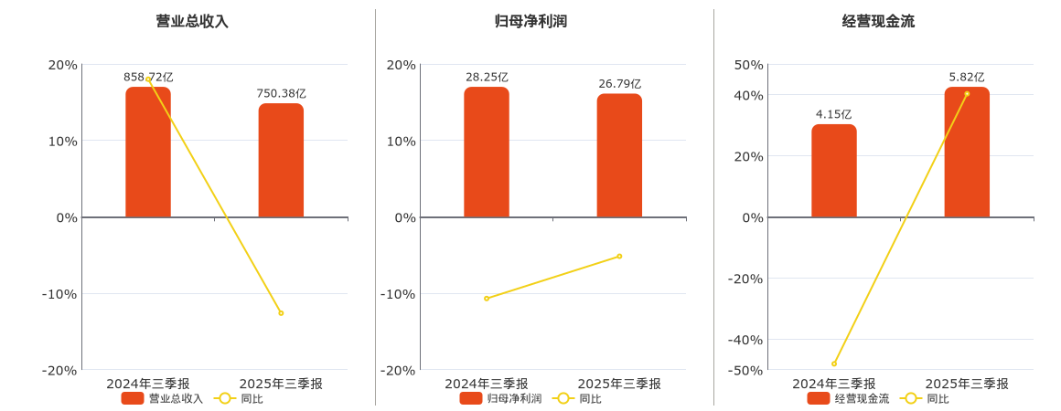 公司营业总收入为750.38亿元,较去年同报告期营业总收入减少108.35亿元,同比较去年同期下降12.62%。归母净利润为26.79亿元,较去年同报告期归母净利润减少1.46亿元,同比较去年同期下降5.17%。经营活动现金净流入为5.82亿元,较去年同报告期经营活动现金净流入增加1.67亿元,同比较去年同期上涨40.24%。