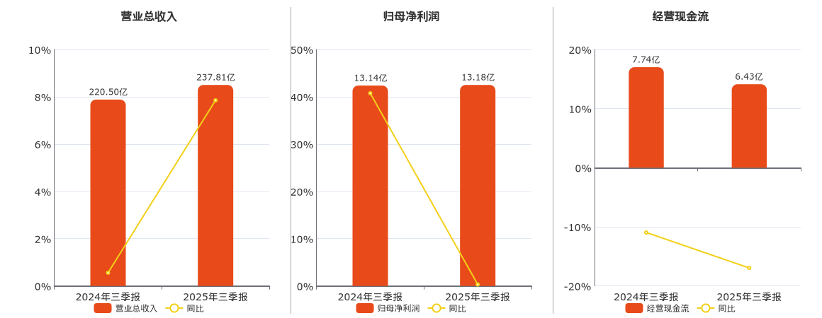 公司营业总收入为237.81亿元,在已披露的同业公司中排名第1,较去年同报告期营业总收入增加17.31亿元,实现2年连续上涨,同比较去年同期上涨7.85%。归母净利润为13.18亿元,在已披露的同业公司中排名第3,较去年同报告期归母净利润增加406.47万元,实现2年连续上涨,同比较去年同期上涨0.31%。经营活动现金净流入为6.43亿元,在已披露的同业公司中排名第8。
