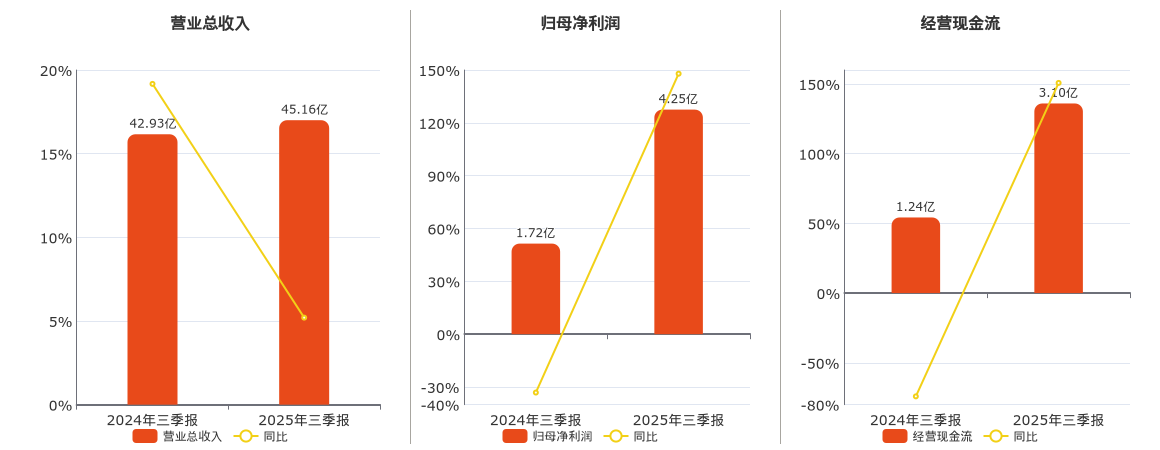 公司营业总收入为45.16亿元,在已披露的同业公司中排名第12,较去年同报告期营业总收入增加2.23亿元,实现2年连续上涨,同比较去年同期上涨5.20%。归母净利润为4.25亿元,在已披露的同业公司中排名第11,较去年同报告期归母净利润增加2.54亿元,同比较去年同期上涨147.91%。经营活动现金净流入为3.10亿元,在已披露的同业公司中排名第14,较去年同报告期经营活动现金净流入增加1.87亿元,同比较去年同期上涨150.73%。