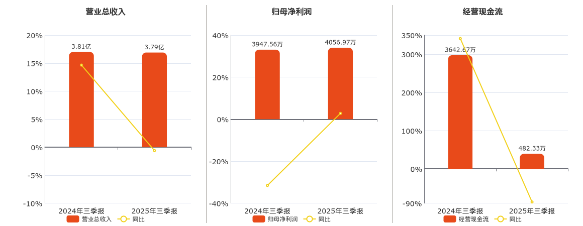 公司营业总收入为3.79亿元,较去年同报告期营业总收入减少227.52万元,同比较去年同期下降0.60%。归母净利润为4056.97万元。经营活动现金净流入为482.33万元,较去年同报告期经营活动现金净流入减少3160.34万元,同比较去年同期下降86.76%。