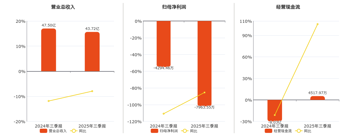 公司营业总收入为43.72亿元,较去年同报告期营业总收入减少3.78亿元,同比较去年同期下降7.96%。归母净利润为-7963.55万元,较去年同报告期归母净利润减少3669.09万元。经营活动现金净流入为4517.97万元,较去年同报告期经营活动现金净流入增加8.48亿元。