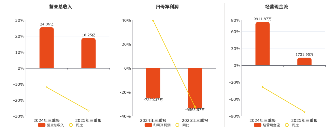 公司营业总收入为18.25亿元,较去年同报告期营业总收入减少6.61亿元,同比较去年同期下降26.61%。归母净利润为-9563.57万元,较去年同报告期归母净利润减少2343.21万元。经营活动现金净流入为1731.95万元,较去年同报告期经营活动现金净流入减少8179.92万元,同比较去年同期下降82.53%。