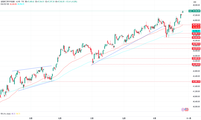受美股普遍上涨的背景影响,道琼指数进一步创下47564点的历史新高,但同时RSI指标位于68,须注意进入超买区域后回落的可能。上涨方面,若能突破47600点的阻力水平,道琼指数接下来的目标为48000点。下跌方面,道琼指数目前的支撑为10月22日低点46461点点,接着为10月16日的低点45781点。