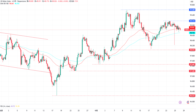 CPT Markets分析师指出,美元指数走势疲软,并跌破了近期EMA50形成的支撑水平。下跌方面,美元指数目前的支撑为10月20日的低点98.416,接着是10月17日的低点98.069。上涨方面,美元指数目前的阻力为10月23日的高点99.173,再来是10月9日的高点99.608。