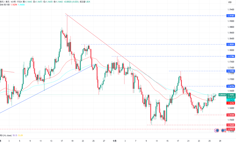 欧元/美元在突破EMA50均线后,继续延续自1.15769开始的回升。上涨方面,欧元/美元目前的阻力为10月20日的高点1.16754,再来是10月17日的高点1.17283。下跌方面,欧元/美元目前的支撑为10月22日的低点1.15769,再来是10月9日的低点1.15420。