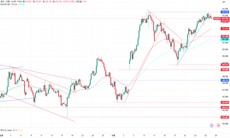 CPT Markets分析师指出,美元/日元受EMA50均线的支撑,持续保持在高点测试153.274的阻力水平。上涨方面,美元/日元目前的阻力10月10日的高点153.274,再来是2月12日的高点154.797。下跌方面,美元/日元初步的支撑为10月22日低点151.485水平,再来是10月20日低点150.272以及10月13日低点149.371。