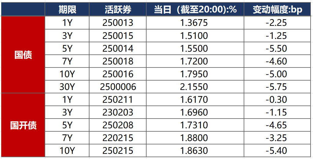 10月27日,受关于MLF利率调降传闻,以及潘行长在金融街论坛上宣布恢复国债买卖操作提振,多头情绪升温,债市大幅走强。截至北京时间20:00,10年期国债活跃券250016收益率下行5.00bp至1.7950%,10年期国开债活跃券250215收益率下行5.40bp至1.8630%。